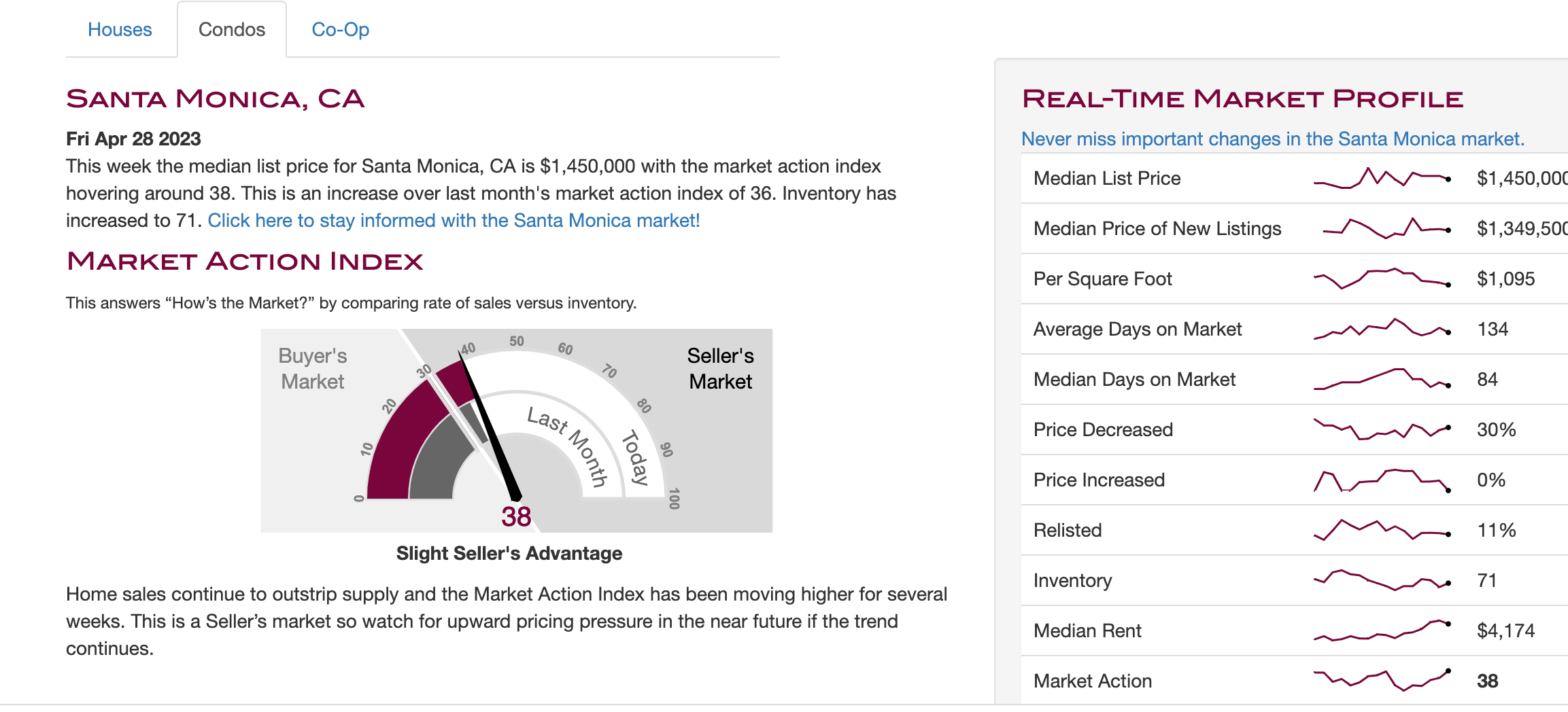 In contrast, this week's median list price for condos in Santa Monica, CA, is $1,450,000; the inventory of condos for sale has increased to 71. Given the current market conditions, where demand exceeds supply, it is a Seller's market for condos in Santa Monica.
