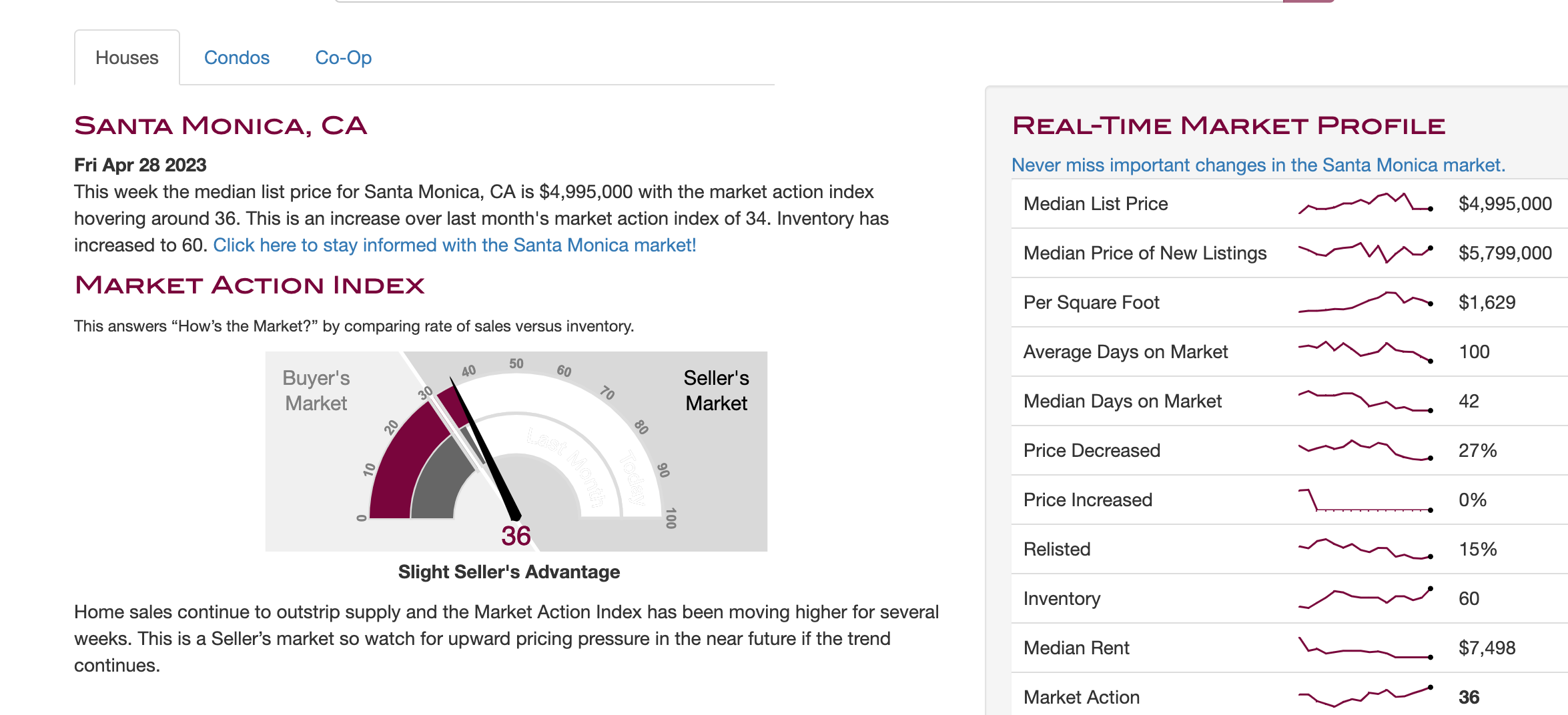 The inventory of homes for sale has increased to 60. However, the demand for homes continues to exceed the supply; this is currently a Seller's market for single-family residences in Santa Monica.